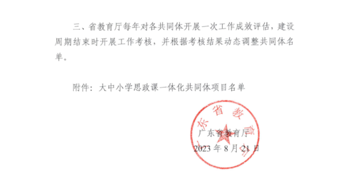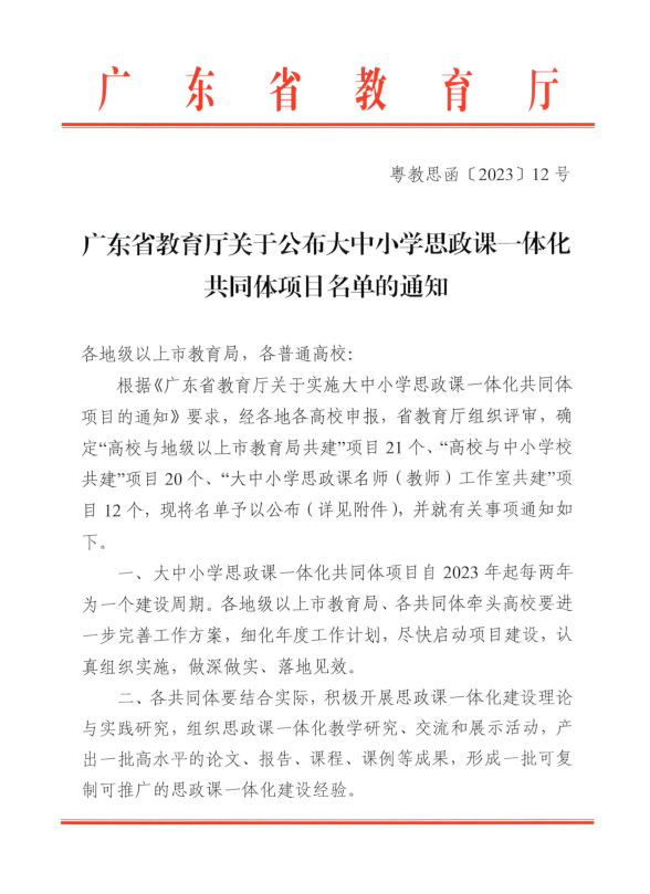 根据《广东省教育厅关于实施大中小学思政课一体化共同体项目的通知》要求,经各地各高校申报,省教育厅组织评审,确定“高校与地级以上市教育局共建”项目21个、“高校与中小公司共建”项目20个、“大中小学思政课名师(教师)工作室共建”项目12个,公司牵头的项目为其中“高校与中小公司共建”项目之一。